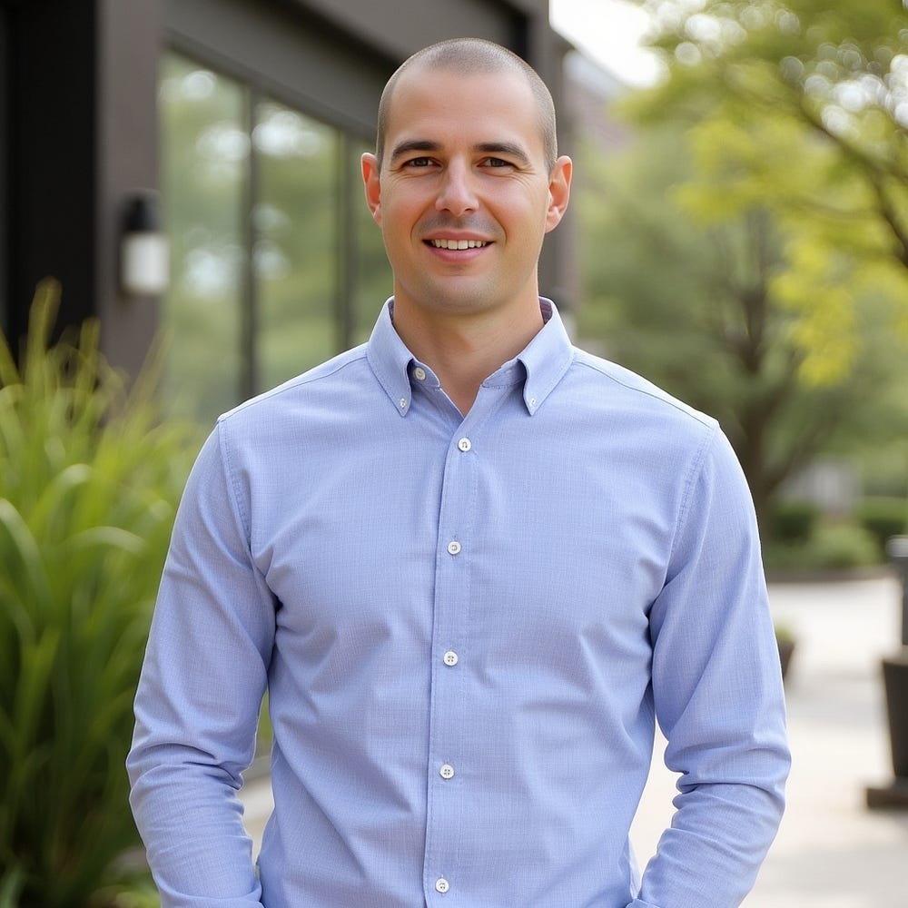 “andrew_11763 A head-and-upper-body shot of Andrew, clean-shaven with a shaved head, wearing a stylish, tailored button-down business casual shirt. He is standing outdoors in natural lighting, with the sunlight gently highlighting his fit physique and sharp features. The background is softly blurred, featuring a natural setting with hints of greenery or a modern outdoor environment. The overall composition balances warmth and professionalism, with Andrew’s confident and approachable expression making it ideal for a high-quality, professional profile photo. The framing captures more of his upper body, showcasing the clean lines and tailored fit of the shirt.”